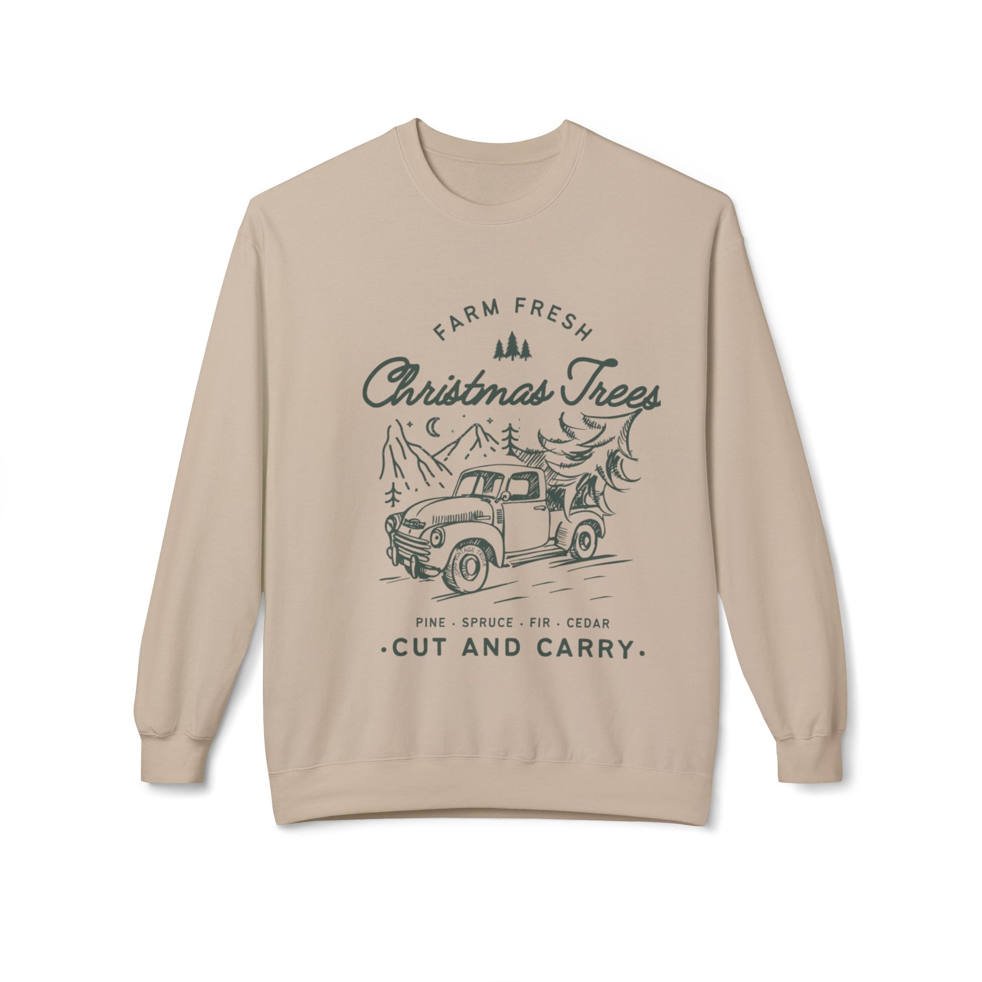 Get ready to celebrate the season with our Farm Fresh Holiday Truck Sweatshirt! 🎄🚚✨ This cozy sweatshirt features a charming vintage truck carrying a beautifully decorated Christmas tree, accompanied by the delightful words ‘Farm Fresh Christmas Trees: Pine, Spruce, Fir - Cut and Carry.’Â