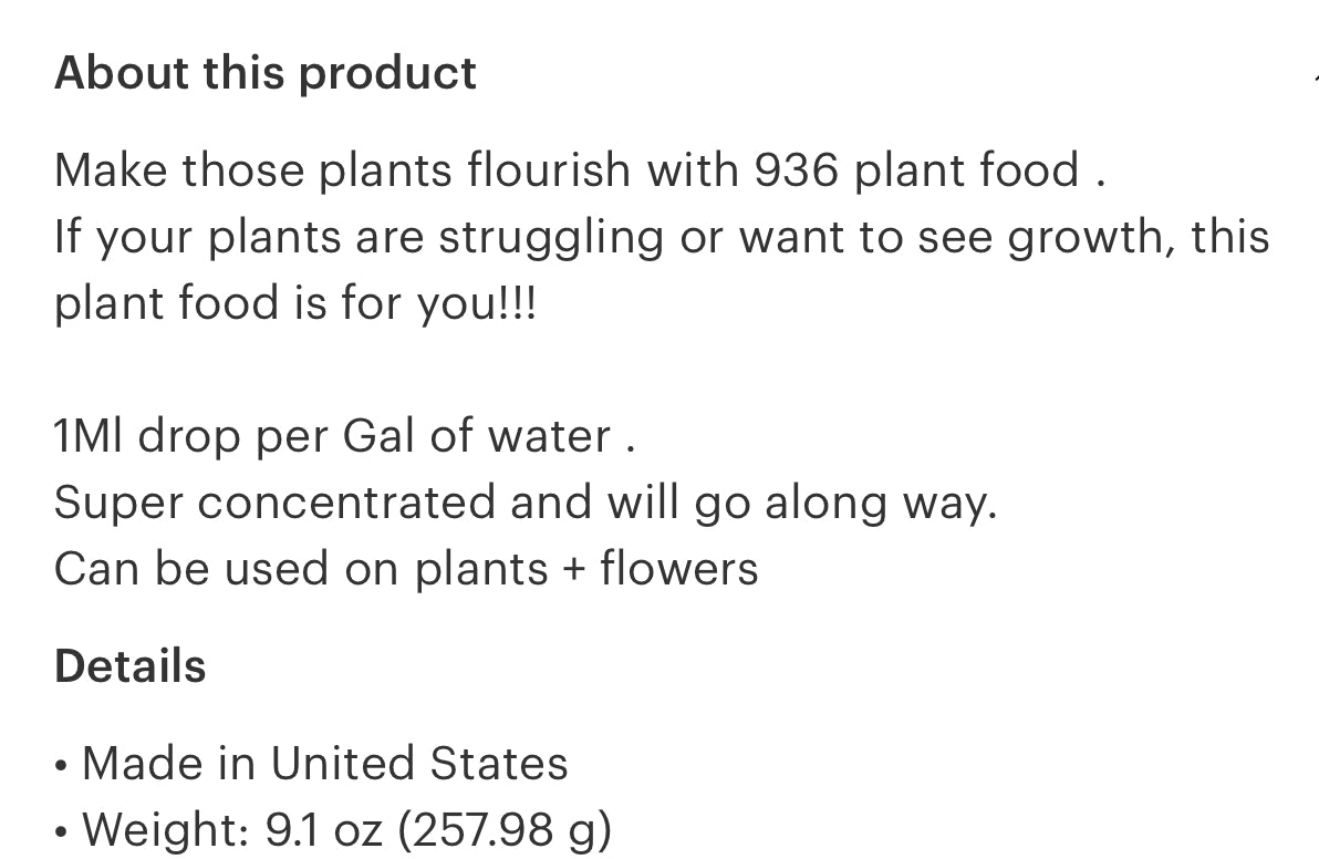 Give your plant the nutrients they crave with 936 plant food- A powerful, super concentrated formula designed to promote healthy growth and vibrant blooms. Whether your plants are struggling or simply want To boost their beauty, this plant food is the perfect solution.