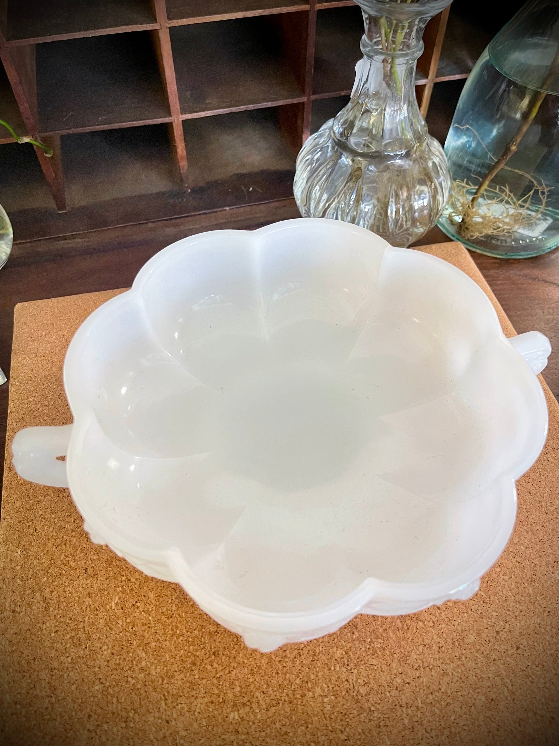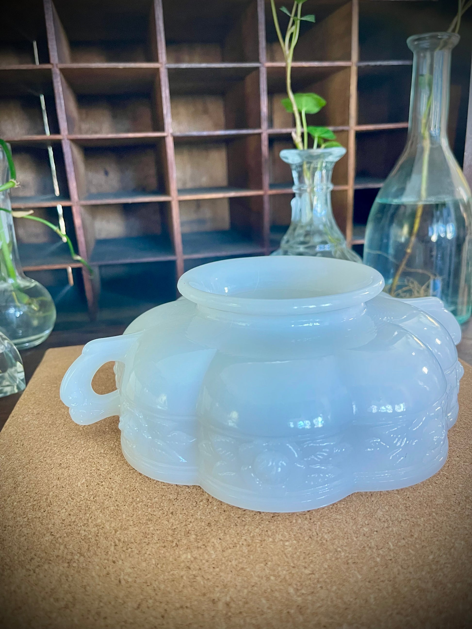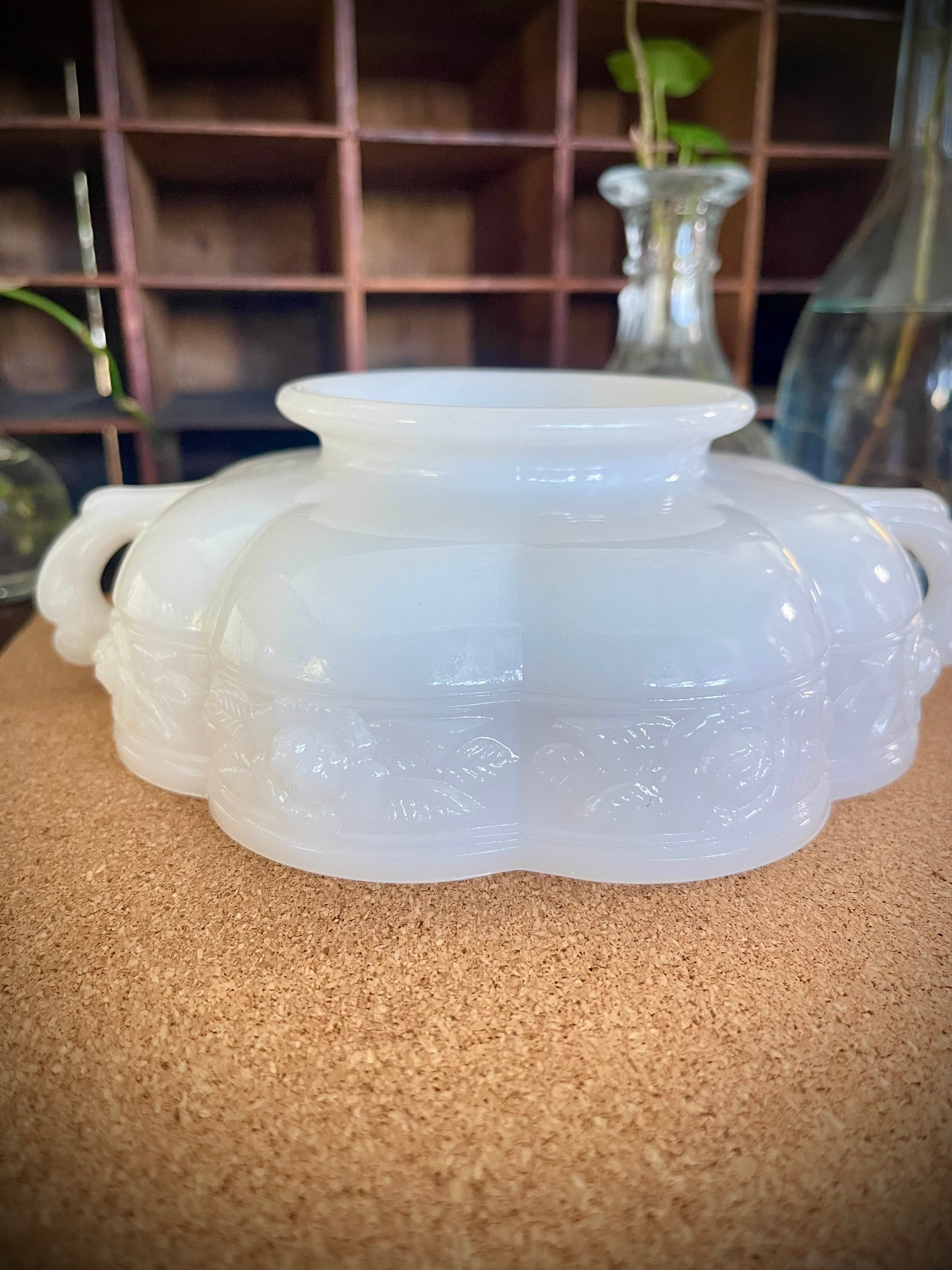 white milk glass, it is dressed to impress with a delicate rose design that wraps around its scalloped